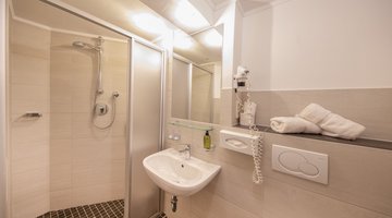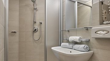 Ausgestattet mit Einzelbett, Dusche/WC, SatTV, Telefon, Radio, Safe und Balkon